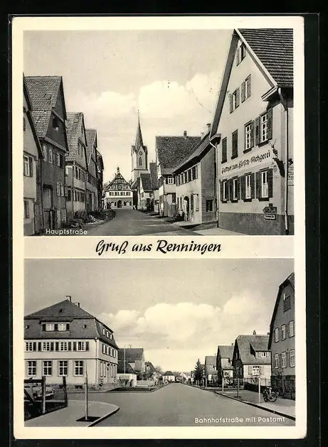 AK Renningen, Hauptstrasse, Bahnhofstrasse mit Postamt