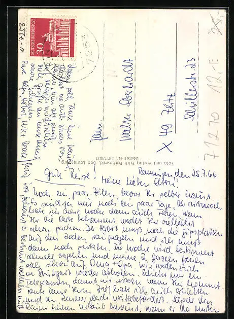Personenbezogene Daten auf der Rückseite der Karte wurden durch blauen Textmarker unkenntlich gemacht. Die blauen Stellen sind auf die Vorderseite durchgeweicht und wirken sich negativ auf das Postkartenfoto aus