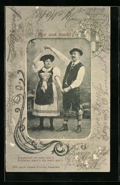 AK Resl und Stachi in Tracht, Volkstanz