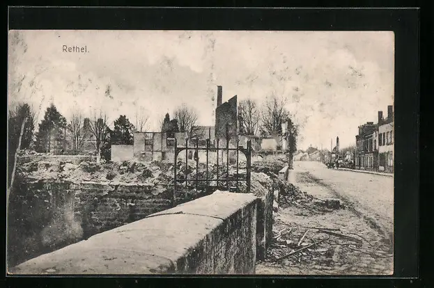 AK Rethel, Ortsansicht mit zerstörten Häusern