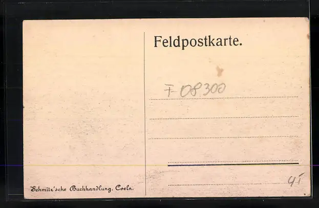 Personenbezogene Daten auf der Rückseite der Karte wurden durch blauen Textmarker unkenntlich gemacht. Die blauen Stellen sind auf die Vorderseite durchgeweicht und wirken sich negativ auf das Postkartenfoto aus