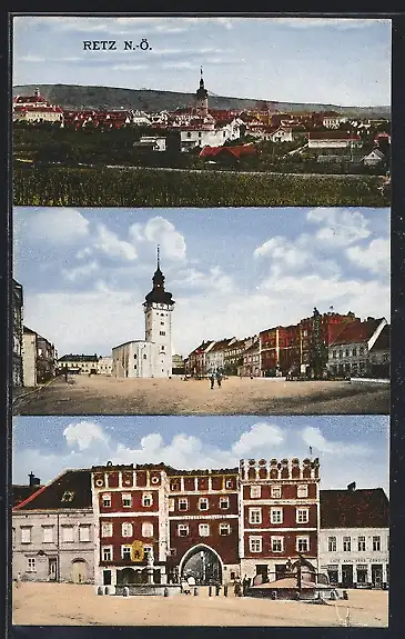 AK Retz, Torgebäude mit Denkmal, Kirche u. Cafe Karl Süss, Ortspartie mit Kirche, Ortsansicht
