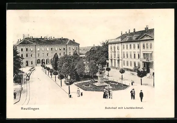 AK Reutlingen, Bahnhof mit Lisztdenkmal