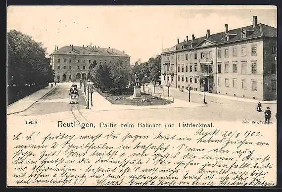 AK Reutlingen, Hotel Kronprinz, Bahnhof und Listdenkmal