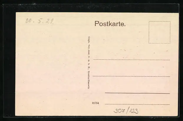 Personenbezogene Daten auf der Rückseite der Karte wurden durch blauen Textmarker unkenntlich gemacht. Die blauen Stellen sind auf die Vorderseite durchgeweicht und wirken sich negativ auf das Postkartenfoto aus