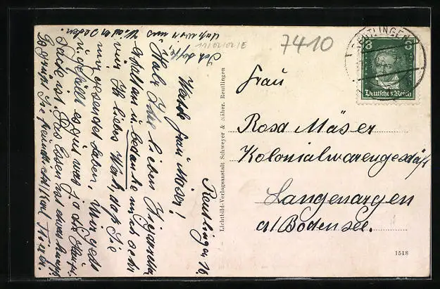 Personenbezogene Daten auf der Rückseite der Karte wurden durch blauen Textmarker unkenntlich gemacht. Die blauen Stellen sind auf die Vorderseite durchgeweicht und wirken sich negativ auf das Postkartenfoto aus