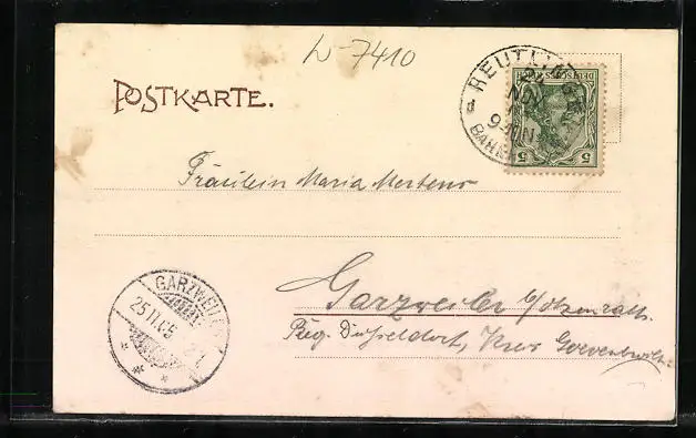 Personenbezogene Daten auf der Rückseite der Karte wurden durch blauen Textmarker unkenntlich gemacht. Die blauen Stellen sind auf die Vorderseite durchgeweicht und wirken sich negativ auf das Postkartenfoto aus