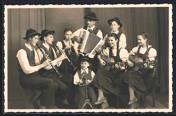 AK Reutte /Tirol, Trachtenkapelle Familie Engel mit Instrumenten