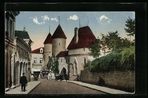 AK Reval, Strassenpartie mit Kirche und Passanten