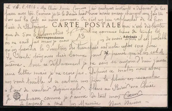 Personenbezogene Daten auf der Rückseite der Karte wurden durch blauen Textmarker unkenntlich gemacht. Die blauen Stellen sind auf die Vorderseite durchgeweicht und wirken sich negativ auf das Postkartenfoto aus