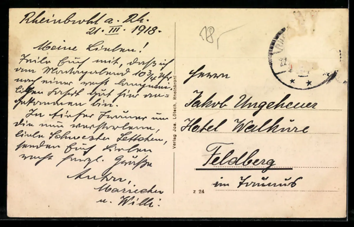 alte Ansichtskarte, gelaufen 1918, Briefmarke entfernt, rückseitig Oberflächenschaden, guter Zustand