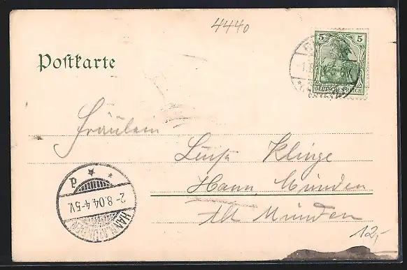 alte Ansichtskarte, gelaufen 1904, Eckknicke oben, minimaler Einriss li. oben, guter Zustand