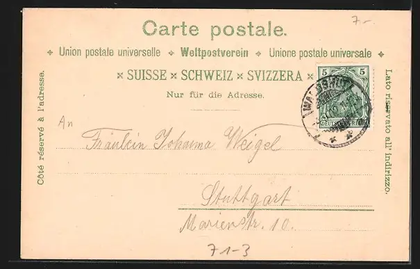 Personenbezogene Daten auf der Rückseite der Karte wurden durch blauen Textmarker unkenntlich gemacht. Die blauen Stellen sind auf die Vorderseite durchgeweicht und wirken sich negativ auf das Postkartenfoto aus