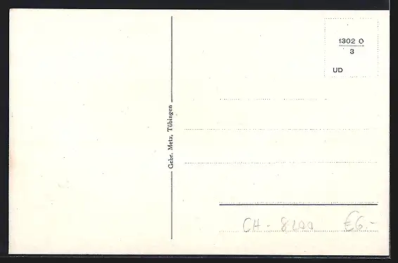 Personenbezogene Daten auf der Rückseite der Karte wurden durch blauen Textmarker unkenntlich gemacht. Die blauen Stellen sind auf die Vorderseite durchgeweicht und wirken sich negativ auf das Postkartenfoto aus