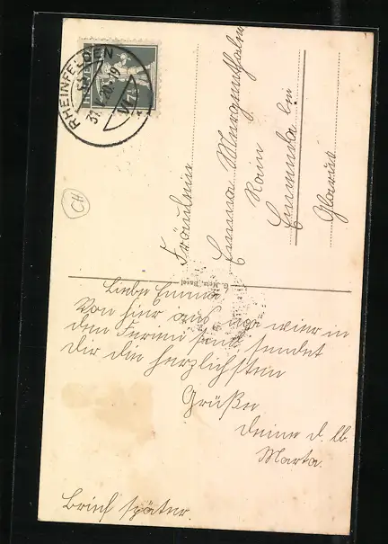 Personenbezogene Daten auf der Rückseite der Karte wurden durch blauen Textmarker unkenntlich gemacht. Die blauen Stellen sind auf die Vorderseite durchgeweicht und wirken sich negativ auf das Postkartenfoto aus