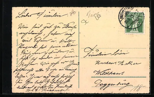 Personenbezogene Daten auf der Rückseite der Karte wurden durch blauen Textmarker unkenntlich gemacht. Die blauen Stellen sind auf die Vorderseite durchgeweicht und wirken sich negativ auf das Postkartenfoto aus