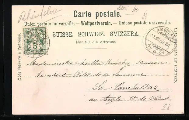 Personenbezogene Daten auf der Rückseite der Karte wurden durch blauen Textmarker unkenntlich gemacht. Die blauen Stellen sind auf die Vorderseite durchgeweicht und wirken sich negativ auf das Postkartenfoto aus