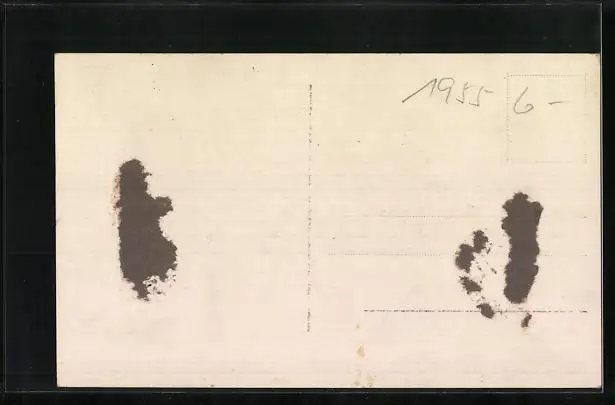 Personenbezogene Daten auf der Rückseite der Karte wurden durch blauen Textmarker unkenntlich gemacht. Die blauen Stellen sind auf die Vorderseite durchgeweicht und wirken sich negativ auf das Postkartenfoto aus