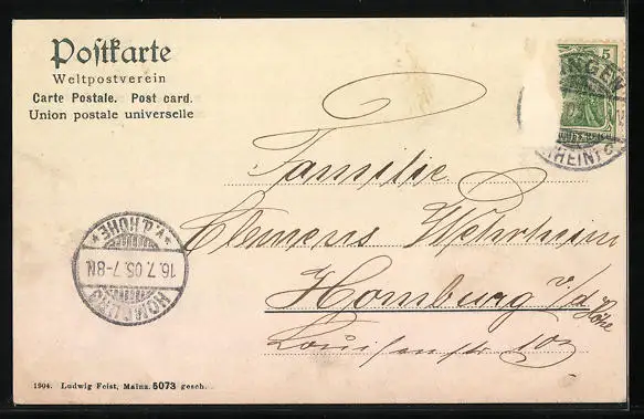 alte Ansichtskarte, gelaufen 1905, Briefmarke entfernt, rückseitig Oberflächenschaden, guter Zustand