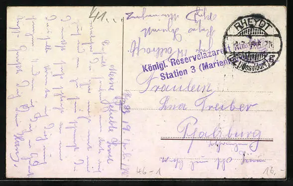 Personenbezogene Daten auf der Rückseite der Karte wurden durch blauen Textmarker unkenntlich gemacht. Die blauen Stellen sind auf die Vorderseite durchgeweicht und wirken sich negativ auf das Postkartenfoto aus