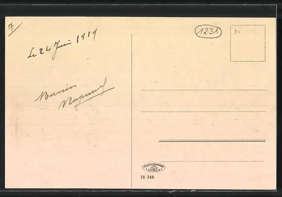 Personenbezogene Daten auf der Rückseite der Karte wurden durch blauen Textmarker unkenntlich gemacht. Die blauen Stellen sind auf die Vorderseite durchgeweicht und wirken sich negativ auf das Postkartenfoto aus
