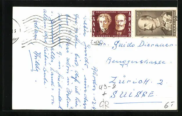 Personenbezogene Daten auf der Rückseite der Karte wurden durch blauen Textmarker unkenntlich gemacht. Die blauen Stellen sind auf die Vorderseite durchgeweicht und wirken sich negativ auf das Postkartenfoto aus