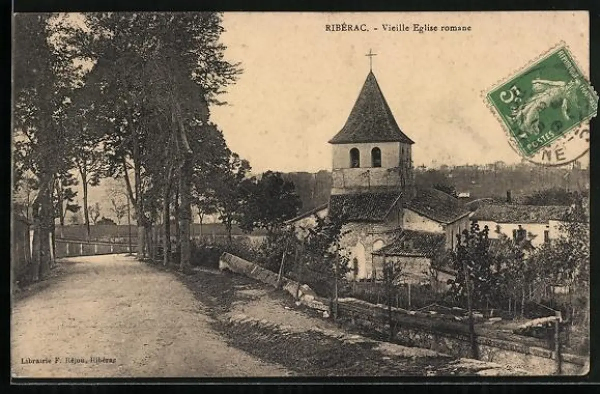 AK Ribérac, Vieille Église romane et chemin bordé d`arbres