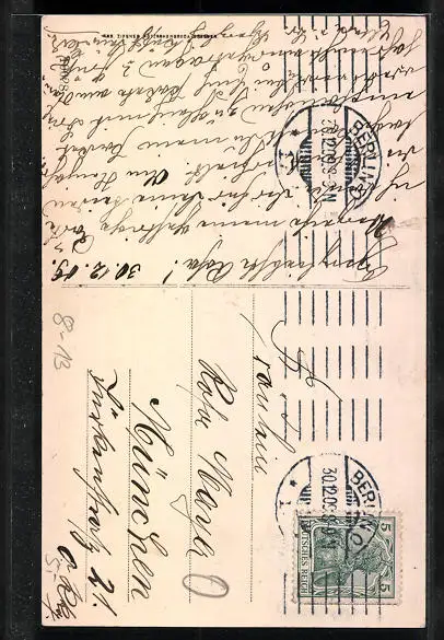 Personenbezogene Daten auf der Rückseite der Karte wurden durch blauen Textmarker unkenntlich gemacht. Die blauen Stellen sind auf die Vorderseite durchgeweicht und wirken sich negativ auf das Postkartenfoto aus