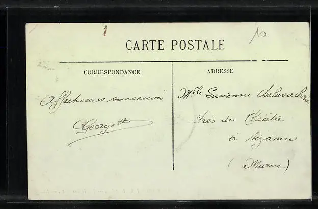 Personenbezogene Daten auf der Rückseite der Karte wurden durch blauen Textmarker unkenntlich gemacht. Die blauen Stellen sind auf die Vorderseite durchgeweicht und wirken sich negativ auf das Postkartenfoto aus