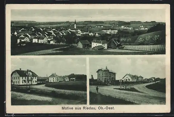 AK Riedau /Ob.-Oest., Strassenpartie mit Häusern, Ortsansicht aus der Vogelschau
