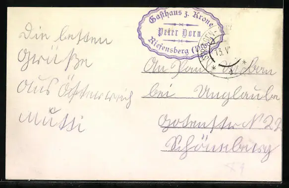 Personenbezogene Daten auf der Rückseite der Karte wurden durch blauen Textmarker unkenntlich gemacht. Die blauen Stellen sind auf die Vorderseite durchgeweicht und wirken sich negativ auf das Postkartenfoto aus