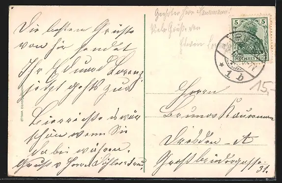 gelaufen 1908, Eckknick oben rechts, guter Zustand