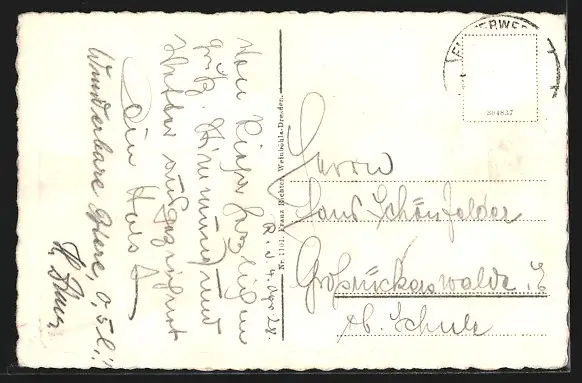 Personenbezogene Daten auf der Rückseite der Karte wurden durch blauen Textmarker unkenntlich gemacht. Die blauen Stellen sind auf die Vorderseite durchgeweicht und wirken sich negativ auf das Postkartenfoto aus