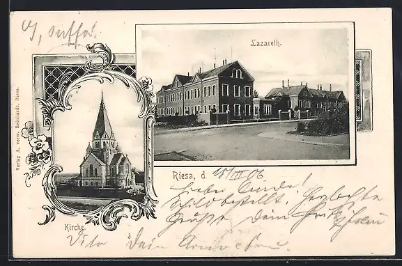 AK Riesa, Strassenpartie am Lazarett, Ansicht der Kirche