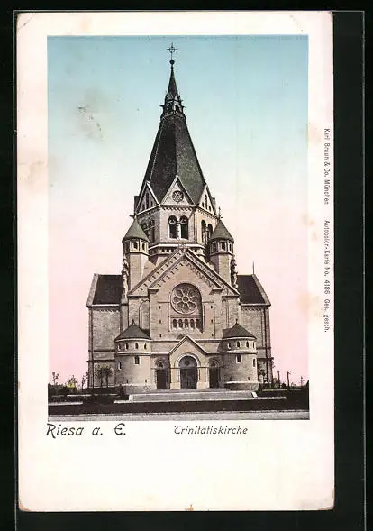 AK Riesa a. E., Frontalansicht der Trinitatiskirche