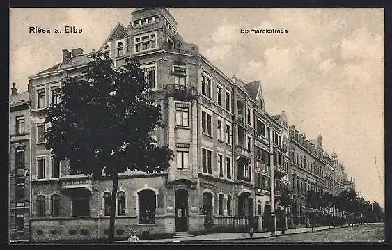 AK Riesa a. Elbe, Bismarckstrasse mit Colonialwaren-Handlung