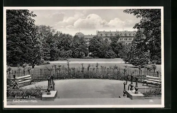 AK Riesa a. d. Elbe, Park, Eingang mit Parkbänken
