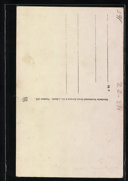 Personenbezogene Daten auf der Rückseite der Karte wurden durch blauen Textmarker unkenntlich gemacht. Die blauen Stellen sind auf die Vorderseite durchgeweicht und wirken sich negativ auf das Postkartenfoto aus