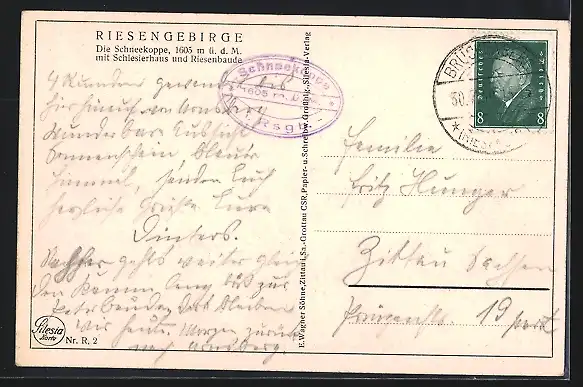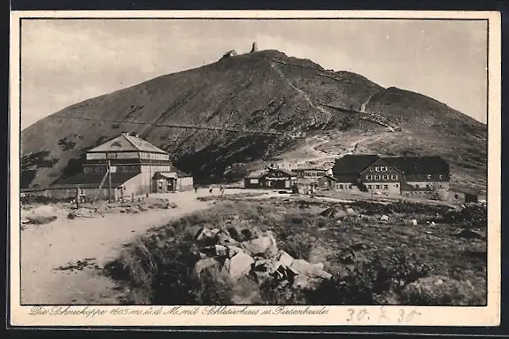 AK Riesenbaude, Ansicht mit Schneekoppe und Schlesierhaus