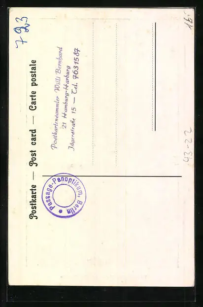 Personenbezogene Daten auf der Rückseite der Karte wurden durch blauen Textmarker unkenntlich gemacht. Die blauen Stellen sind auf die Vorderseite durchgeweicht und wirken sich negativ auf das Postkartenfoto aus