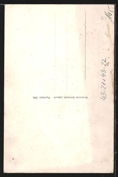 Personenbezogene Daten auf der Rückseite der Karte wurden durch blauen Textmarker unkenntlich gemacht. Die blauen Stellen sind auf die Vorderseite durchgeweicht und wirken sich negativ auf das Postkartenfoto aus