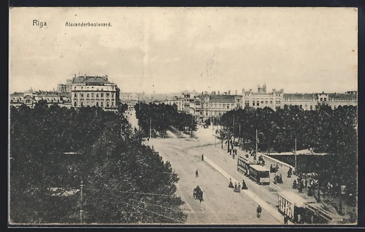 AK Riga, Alexanderboulevard mit Strassenbahn aus der Vogelschau