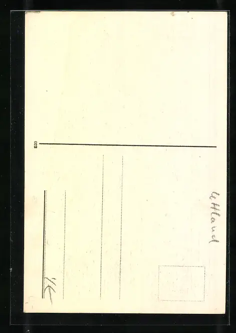 Personenbezogene Daten auf der Rückseite der Karte wurden durch blauen Textmarker unkenntlich gemacht. Die blauen Stellen sind auf die Vorderseite durchgeweicht und wirken sich negativ auf das Postkartenfoto aus