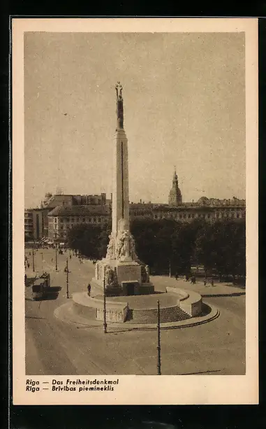 AK Riga, Freiheitsdenkmal mit Strassenbahn