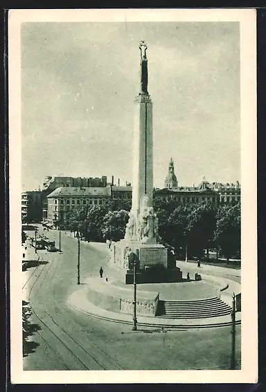 AK Riga, Strassenbahnen am Freiheitsdenkmal