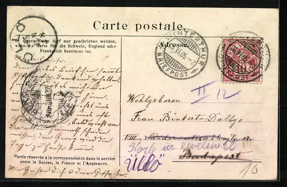 gelaufen 1905, Eckknick oben li., guter Zustand