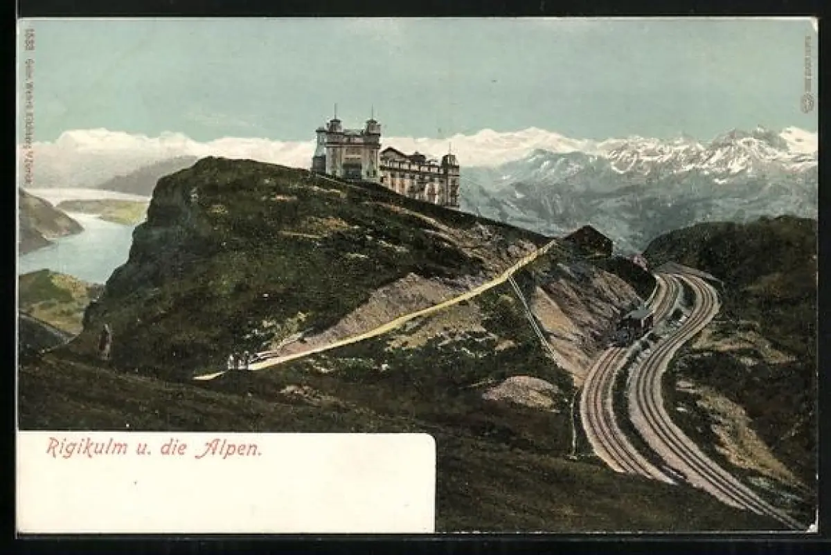 AK Rigikulm, Hotel und die Alpen mit Bergbahn