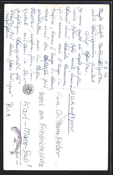 Personenbezogene Daten auf der Rückseite der Karte wurden durch blauen Textmarker unkenntlich gemacht. Die blauen Stellen sind auf die Vorderseite durchgeweicht und wirken sich negativ auf das Postkartenfoto aus