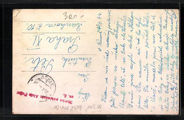 Personenbezogene Daten auf der Rückseite der Karte wurden durch blauen Textmarker unkenntlich gemacht. Die blauen Stellen sind auf die Vorderseite durchgeweicht und wirken sich negativ auf das Postkartenfoto aus