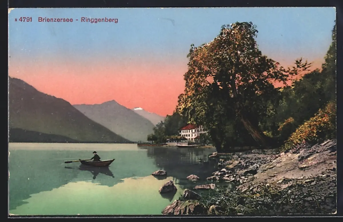 AK Ringgenberg /Brienzersee, Panorama mit Boot